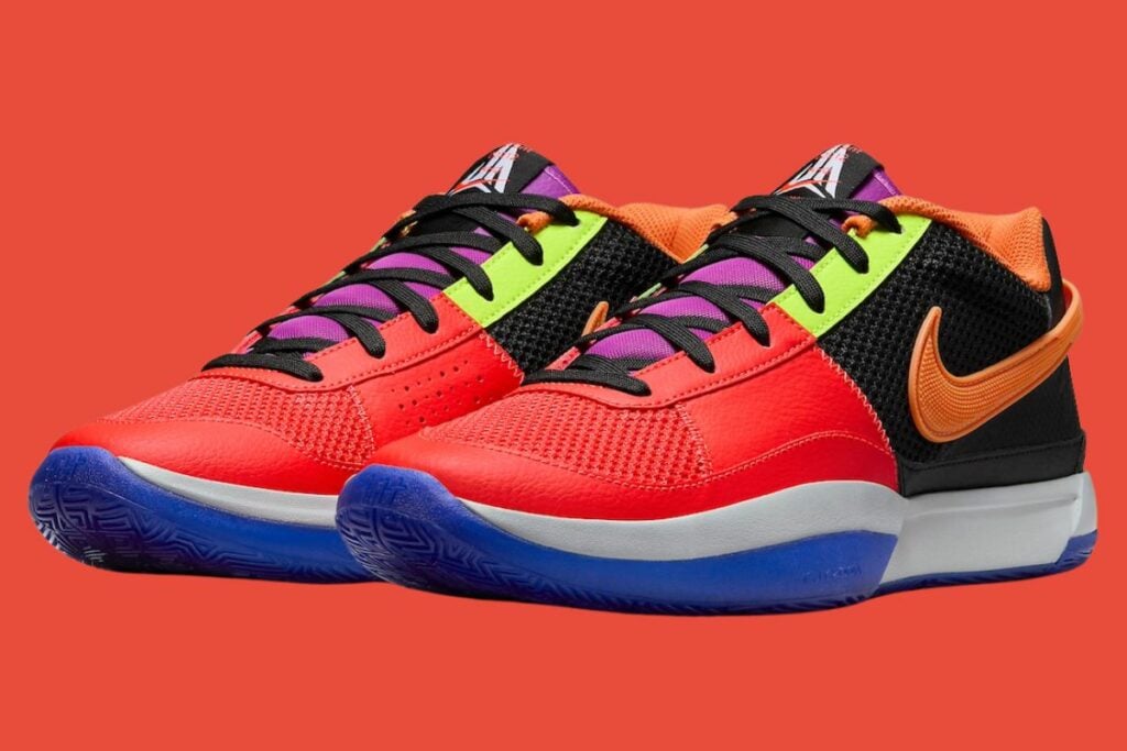 This Nike Ja 1 comes dressed in a Black, Wolf Grey, Racer Blue, Bright Crimson, Bright Mandarin, and Volt color combination. The tongue comes with a badge, while the insoles have reminder slips layered. As for the upper, various bright shades are plastered, with Bright Crimson on the toe, Orange on the Swoosh and liner, Purple tongues, and Volt on the upper eyestays. Black appears on the panels, around the heel, tongue label, and laces. His number 12 on the heels is mismatched, and Purple hits his signature on the lateral sides. Highlighting the shoes is a translucent Blue outsole with one of Morant’s memorable tweets: “Now I’m proud to say I work for the Check.”